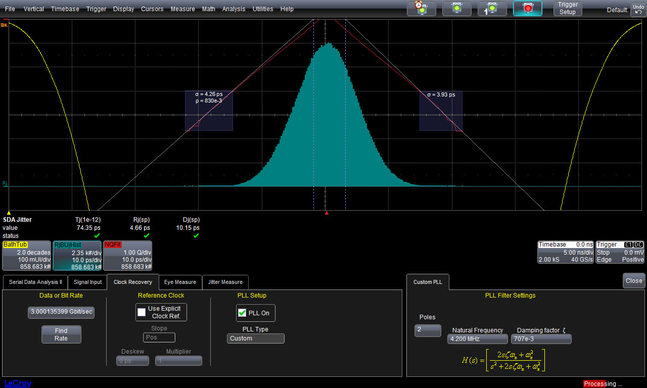 The use of Spread Spectrum Clocking (SSC) in transmitted signals is an optional feature of the SATA specification. When SSC is enabled, measurements such as frequency modulation rate and deviation must also be verified per the specification. The QPHY-SATA software works in conjunction with the deep memory and powerful analysis library of the SDA instrument family to greatly simplify this verification process. Clock recovery circuitry and clock extraction via Phase-Locked Loops (PLLs) is another significant design consideration. Flexible clock recovery options in the SDA allow for the replication of virtually any real receiver PLL configuration, enabling the simulation of "what if" scenarios. Jitter results can be measured exactly as the receiver would see them.