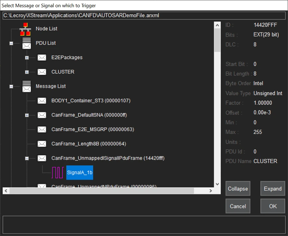 CAN Symbolic options support use of a customer-supplied DBC or ARXML file for signal selection for triggering and